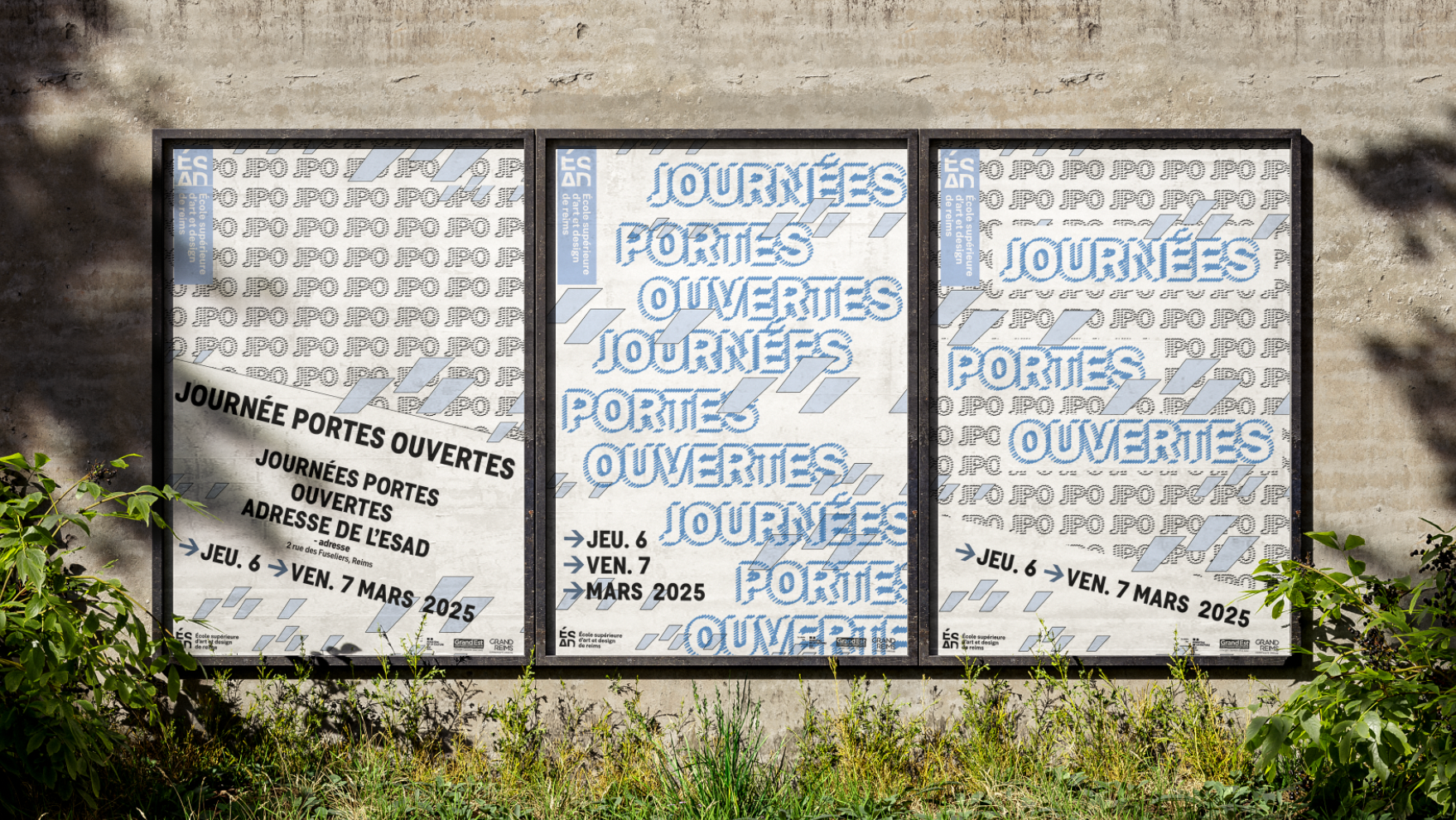 Tour à tour signe isolé ou motif démultiplié, l’accent aigu du “É” de l’ÉSAD devient texture, motif ou mouvement selon le contexte d’usage. Symbole d’élévation et de progression, il évoque aussi la dynamique de groupe et la circulation du savoir propre à l’école. Ce choix met en avant l’attention portée au détail, la finesse du geste et la sensibilité. L’accent devient un repère visuel fort, identifiable et modulable.