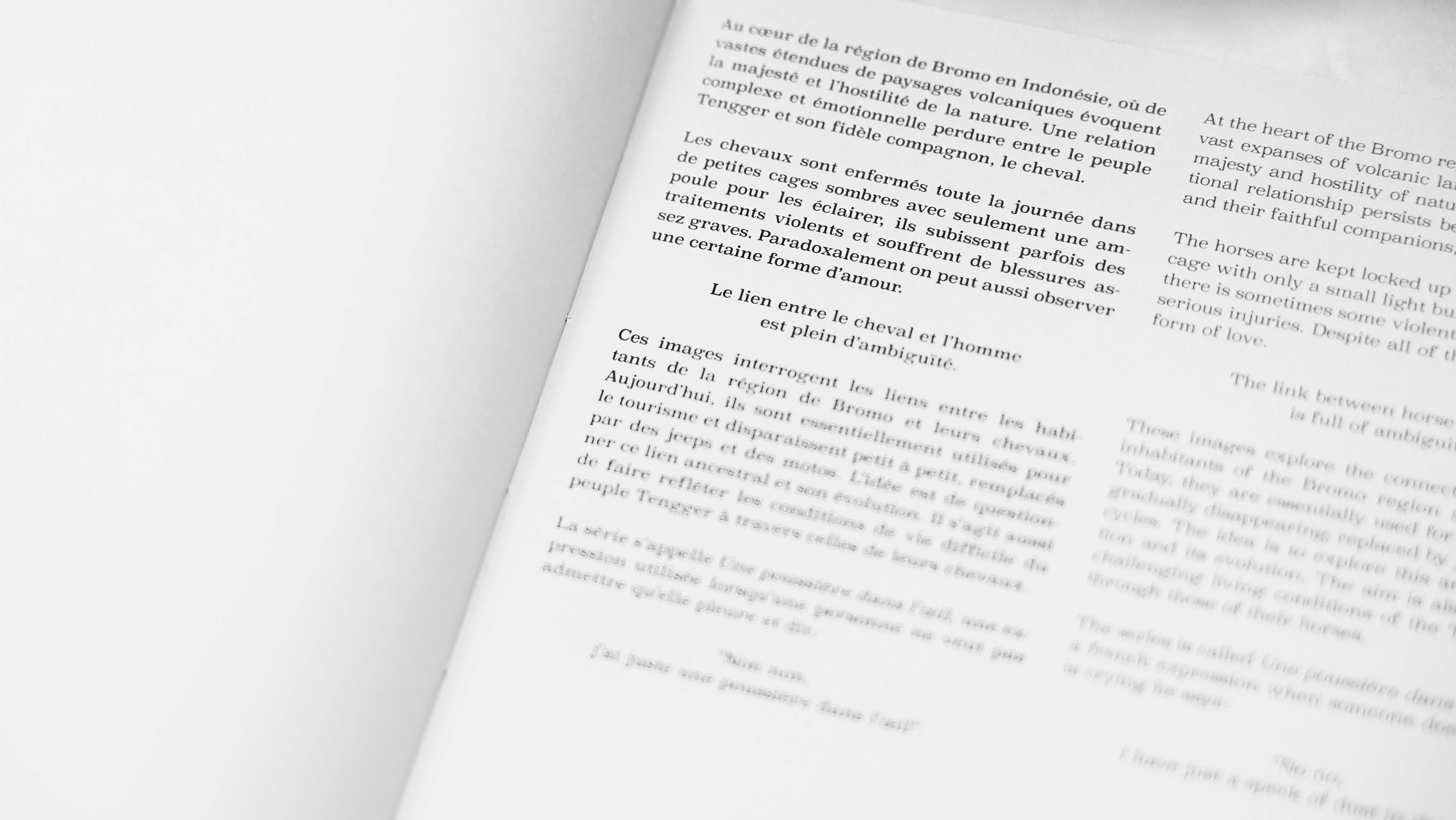 Édition photographique "Une poussière dans l'oeil" de Thomas Pringault (jeune photographe) à propos d’un voyage à Bromo en Indonésie. Élaboration d'une narration entre les photographie, confrontation, figures de style, jeux de paradoxe