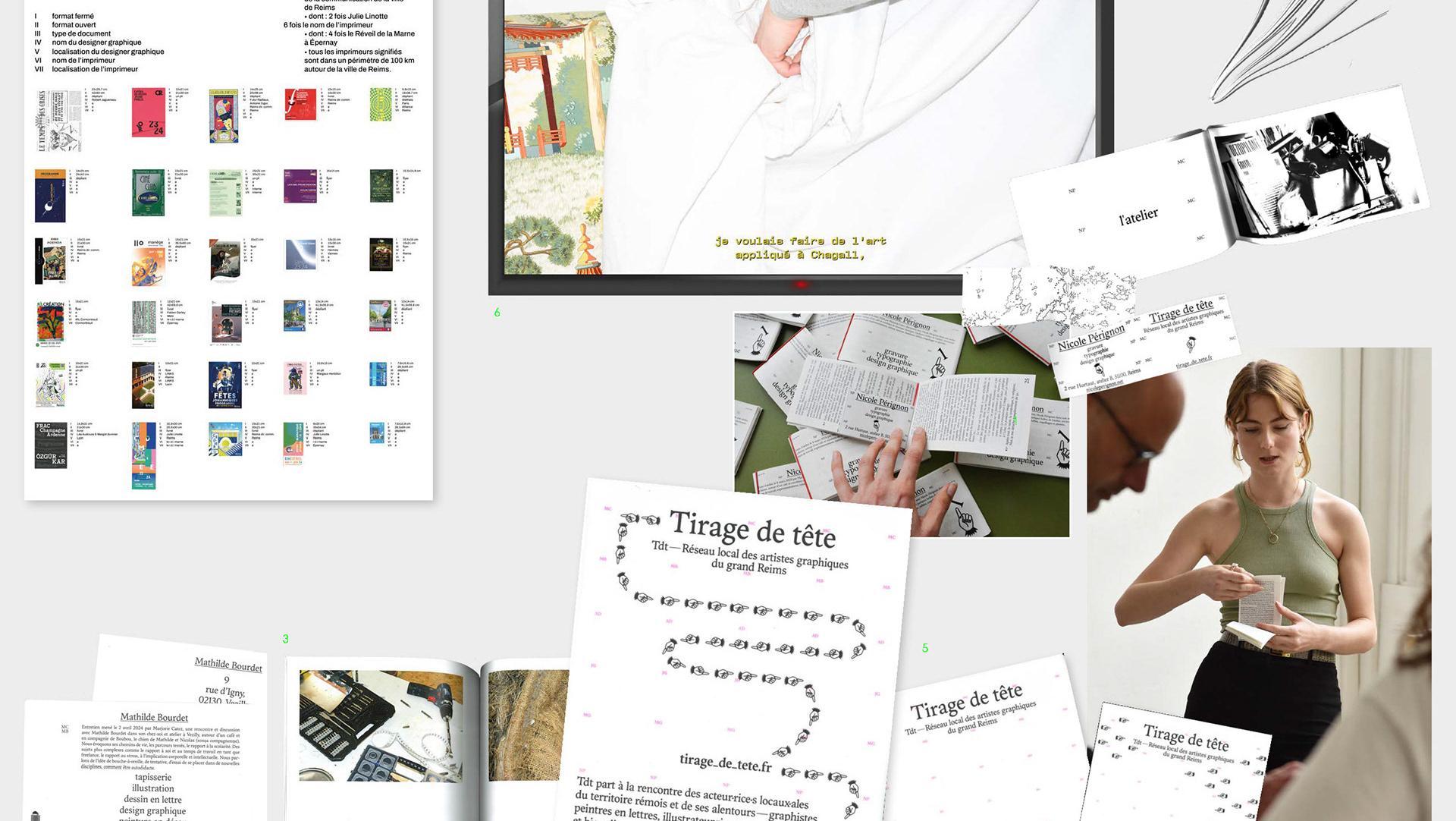 Sous la forme d’étude sur le terrain (sociologique), reportage photographique (...) Suite à ces rencontres et aux problématiques soulevées, j’ai choisi de mettre en place un réseau, Tirage de tête, réseau local des artistes graphiques du grand Reims. Voici donc des recherches graphiques d’objets de ce réseau, une revue en deux numéros, des affiches, un site web, une identité, des objets...