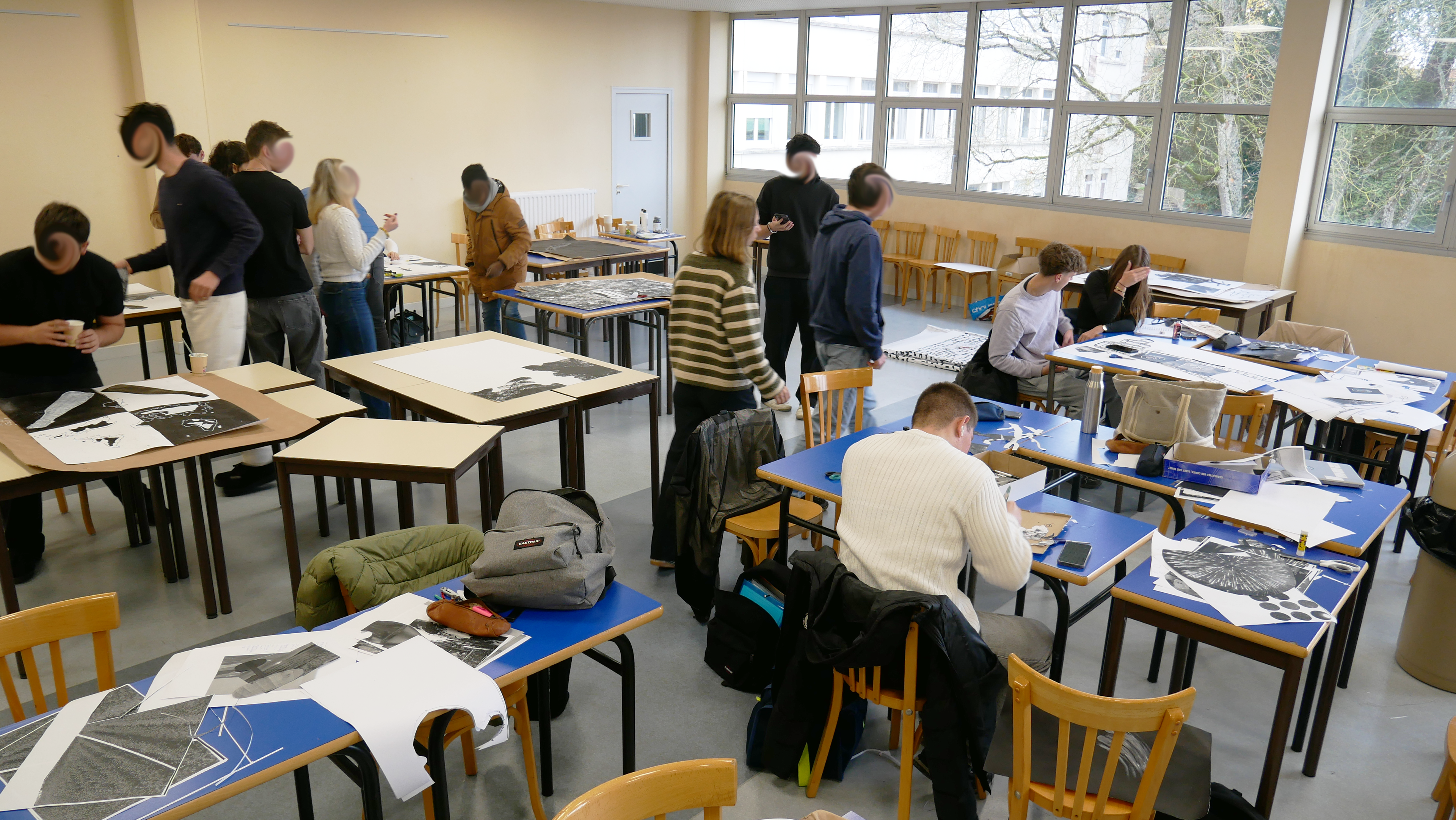 Résultat de ce labo de recherche, scan, zoom dans la trame, impression, réimpression, peinture, pochoir, tampons […] Le tout sans ordinateur ni écran, simplement leur imagination, du papier, de l’encre, leurs mains & leur humour !