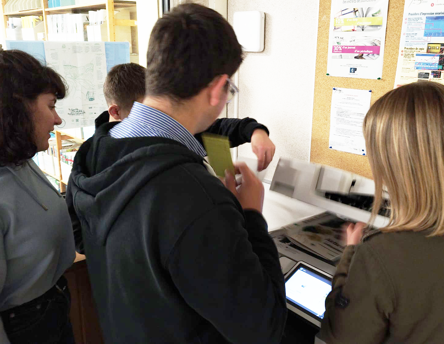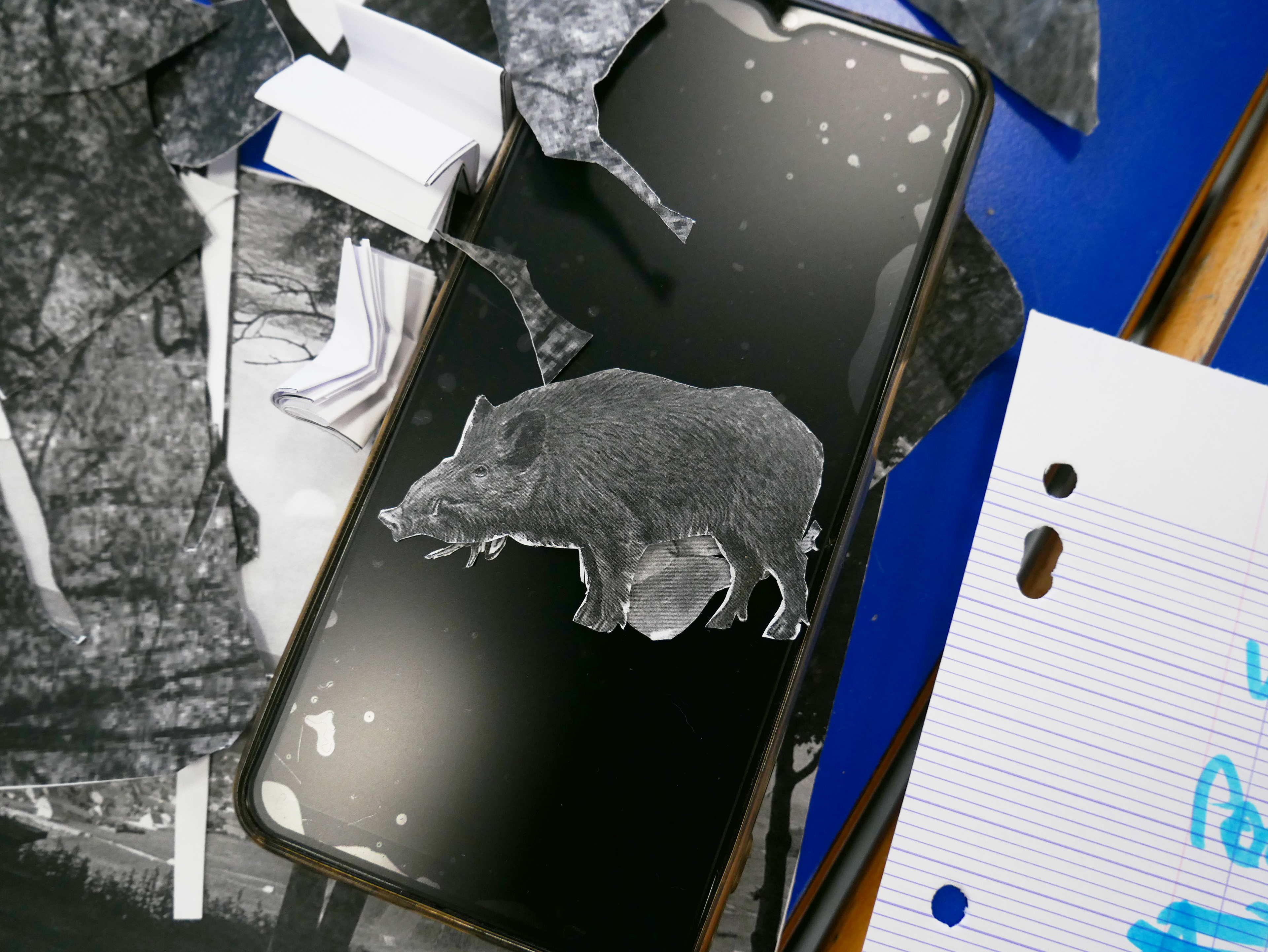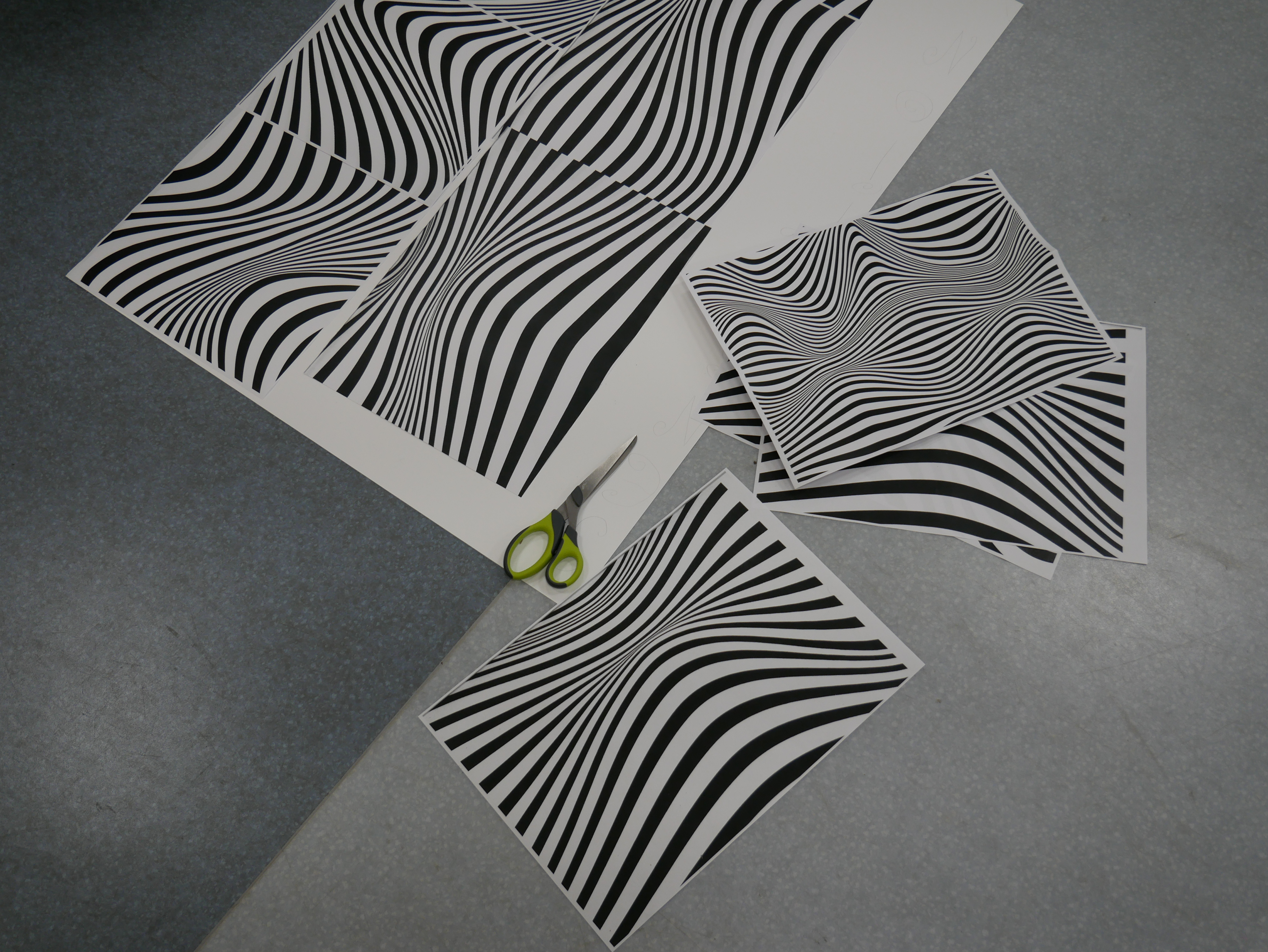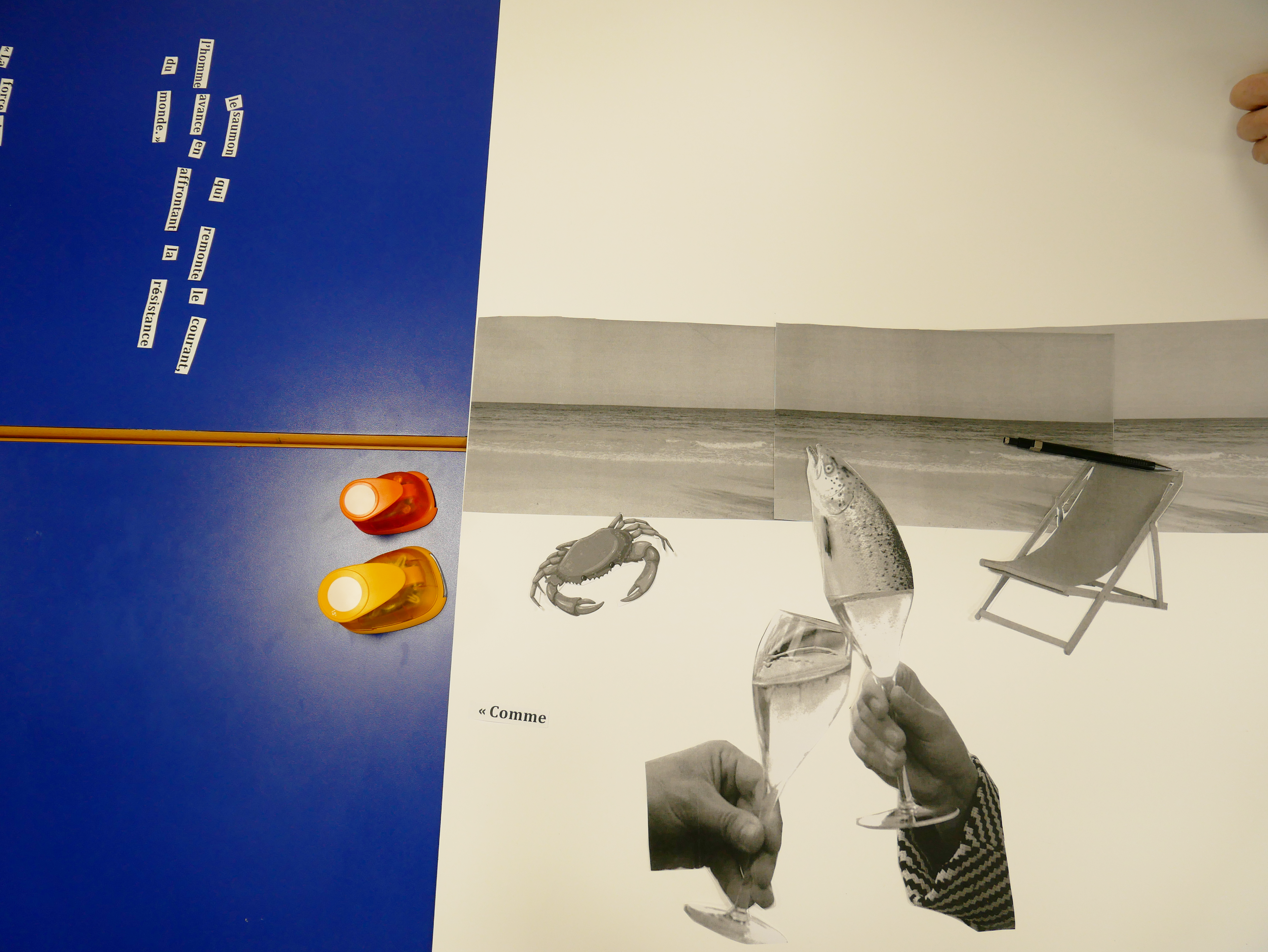 résultat de ce labo de recherche, scan, zoom dans la trame, impression, réimpression, peinture, pochoir, tampons […] Le tout sans ordinateur ni écran, simplement leur imagination, du papier, de l’encre, leurs mains & leur humour !
